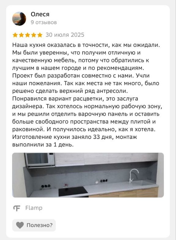Наша миссия – это забота о клиентах. Мы стремимся к тому, чтобы не только мебель была красивой, эстетичной и оставляла только позитивные эмоции, но и каждый этап взаимодействия с нашей компанией и нашими сотрудниками был понятным и приятным. Удобство и наслаждение нашей кухней, радость от ее использования, довольные клиенты и их семьи – это то, что дает нам стимул расти и двигаться вперед, покоряя новые горизонты.